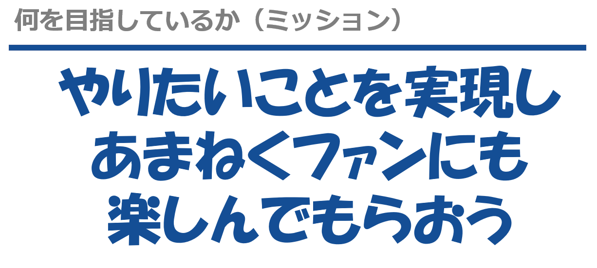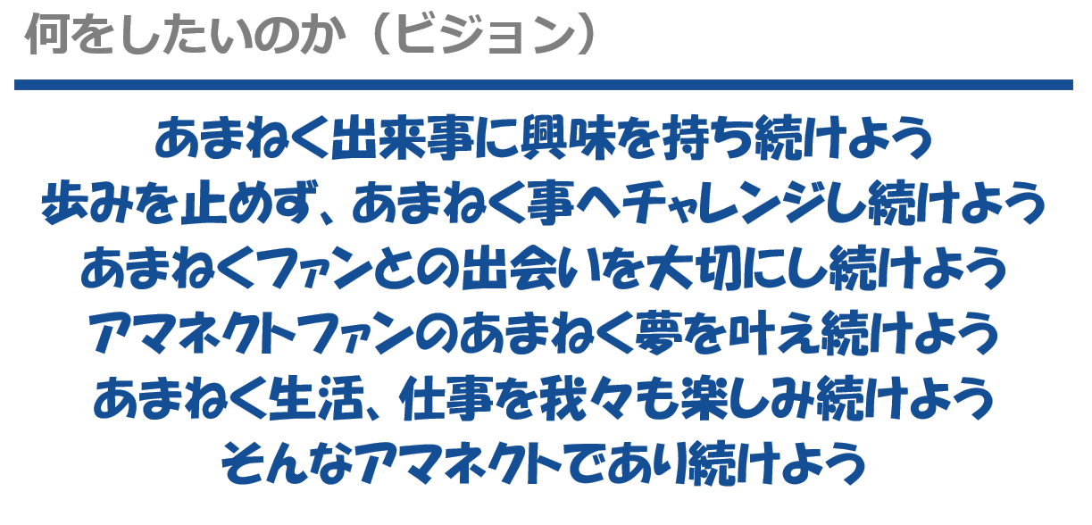 改めて企業理念を掲げます2023年3月1日弊社が何を目指しているのか(ミッション)、弊社として何をしたいのか(ビジョン)を掲げ、自分たちが楽しみ、お客様に楽しんでもらえるかを考え実行し、成長し続けます。